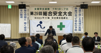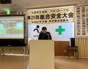 年に一度、全国安全週間(7/1~7/7)に先立ち、労働基準監督署の指導の下、中川組と協力業者の社員全員で安全に対しての意識向上を行います。