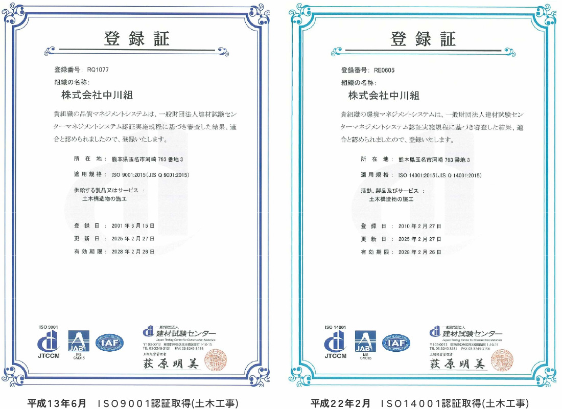 ・ISO9001認証取得(土木工事) ・ISO14001認証取得(土木工事)
