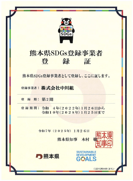 株式会社中川組は、持続可能な開発目標(SDGs)に積極的に取り組む企業として、熊本県SDGs登録事業者に認定されました。