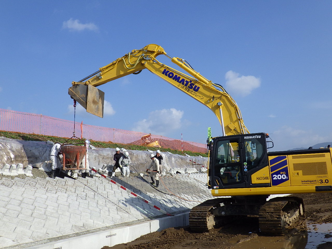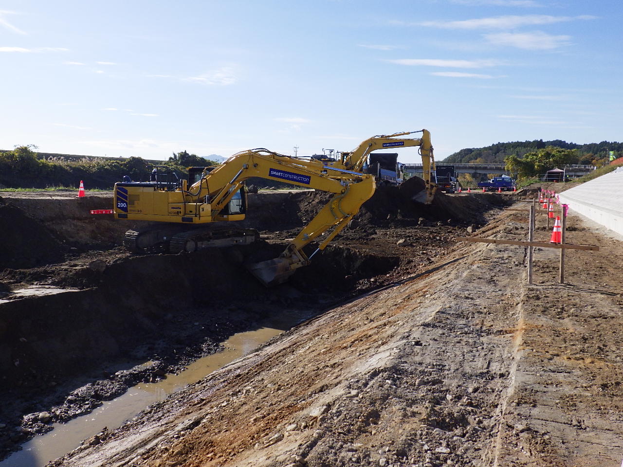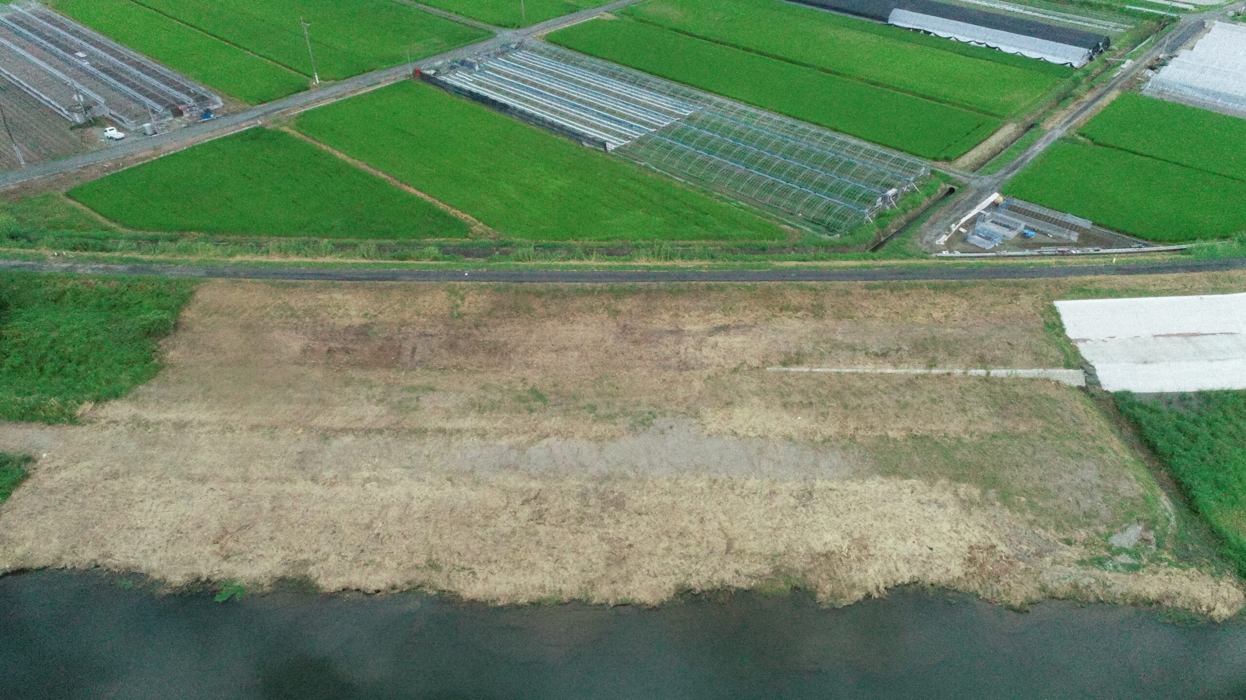 当現場は、菊池川河川事務所発注工事の河道掘削及び護岸工事でした。 工事箇所へ進入する際の工事用道路は、岩野川を横断する形で設置するため、河川増水時の対策を検討する必要がありました。 排水部分は仮設桟橋にて対応し、仮設道路を流出させることなく完了することができました。 また、護岸工事については、延長100m・面積1,500m2と数量が多いため、2班施工とし、工期内に無事故で竣工することができました。 【工期:R07.07.07 ~ R08.03.13】