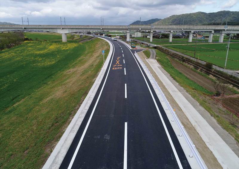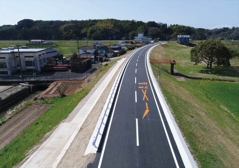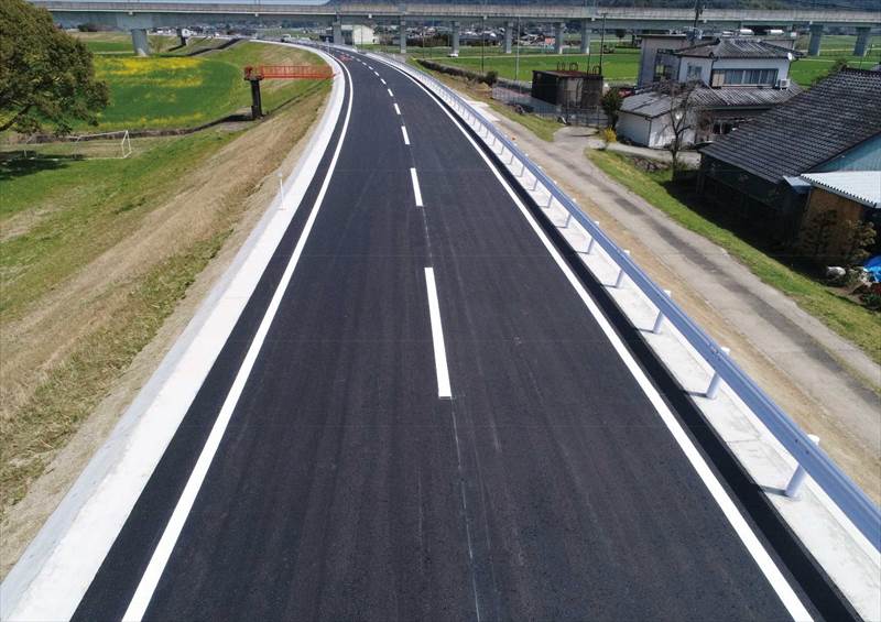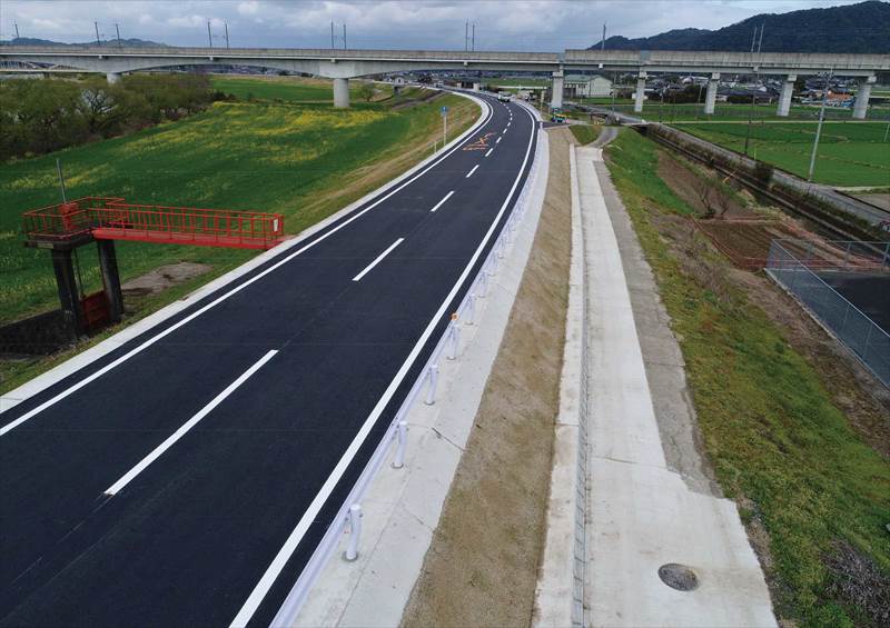 菊池川堤防の拡幅工事です。 交通の流れがスムーズになりました。【工期:H29.12.13 ~ H30.03.23】